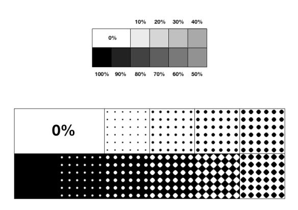 En casi todos los sistemas de impresión, las tintas funcionan siempre con la misma intensidad, es decir: no se puede aplicar una misma tinta de forma más clara o más oscura. El proceso es binario: se aplica, o no se aplica tinta, sobre cierta superficie.