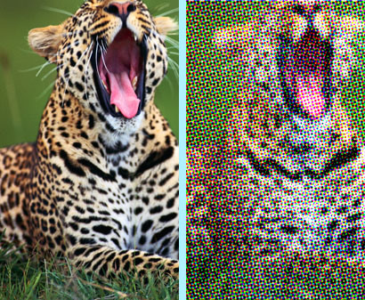 A continuación se pueden ver unas pruebas con las cuatro tintas al 50%. En la fila superior los colores no se encuentran tramados (como se vería en una computadora), en la segunda fila ya están tramados, como pasarían a una forma impresora de offset, por ejemplo.