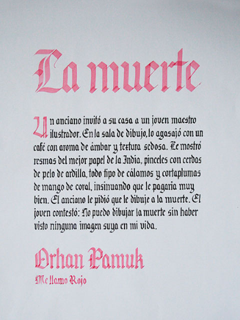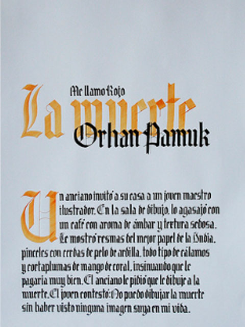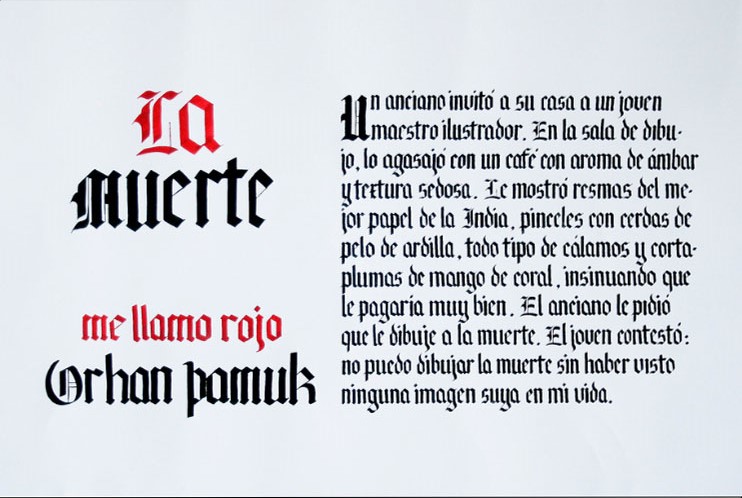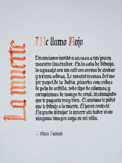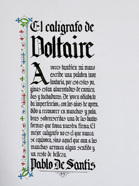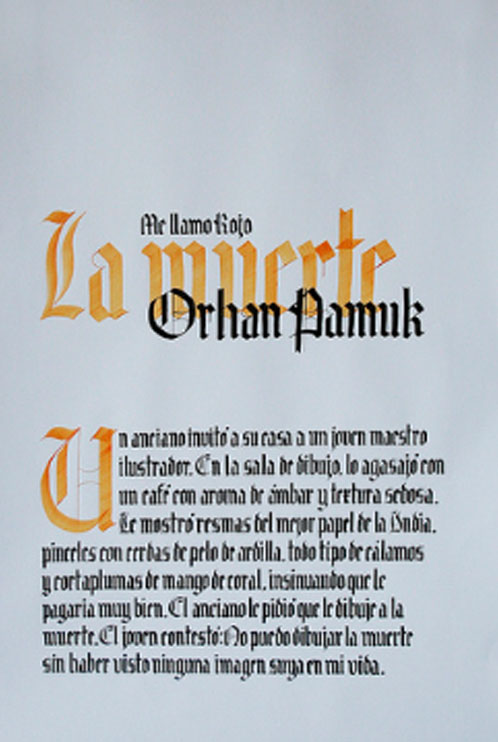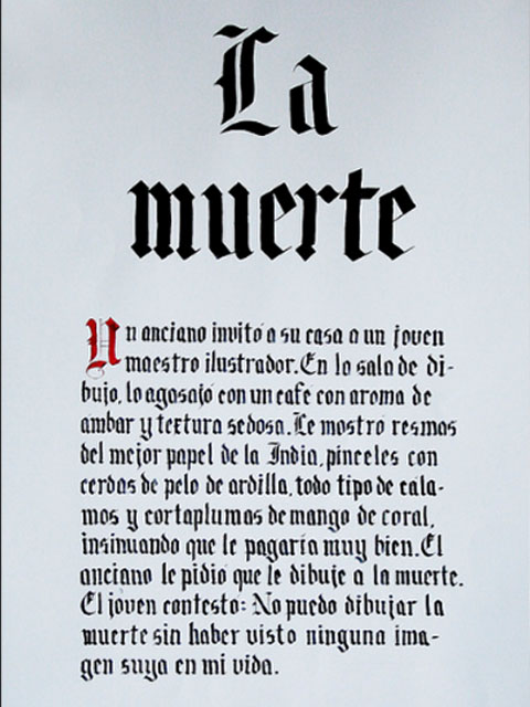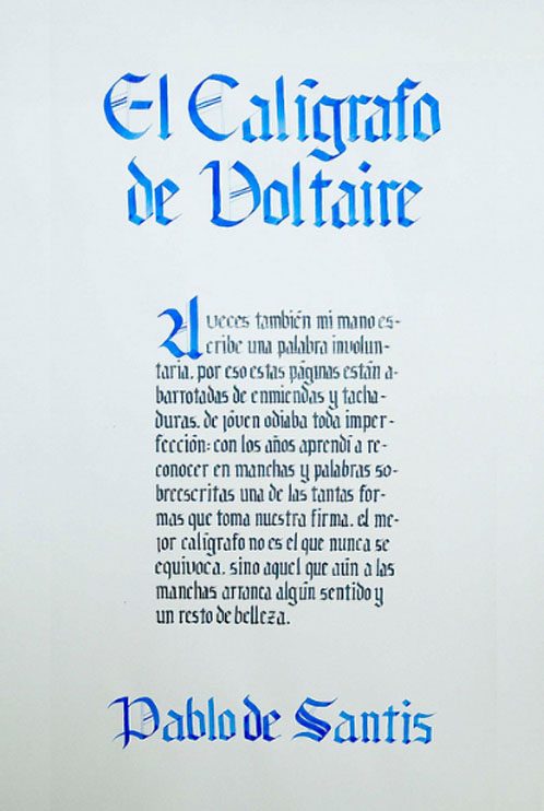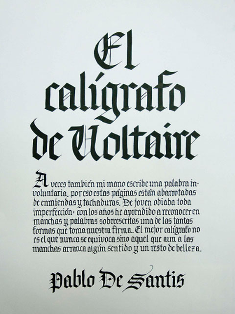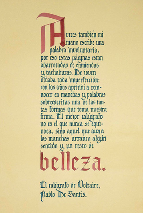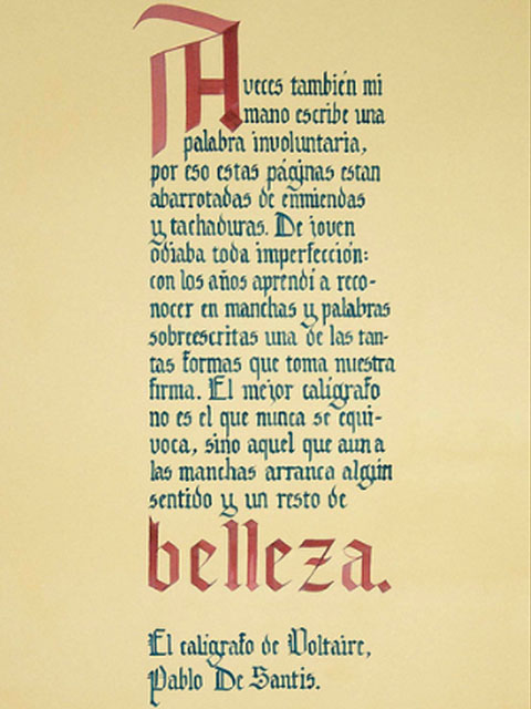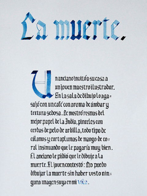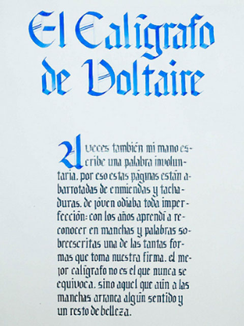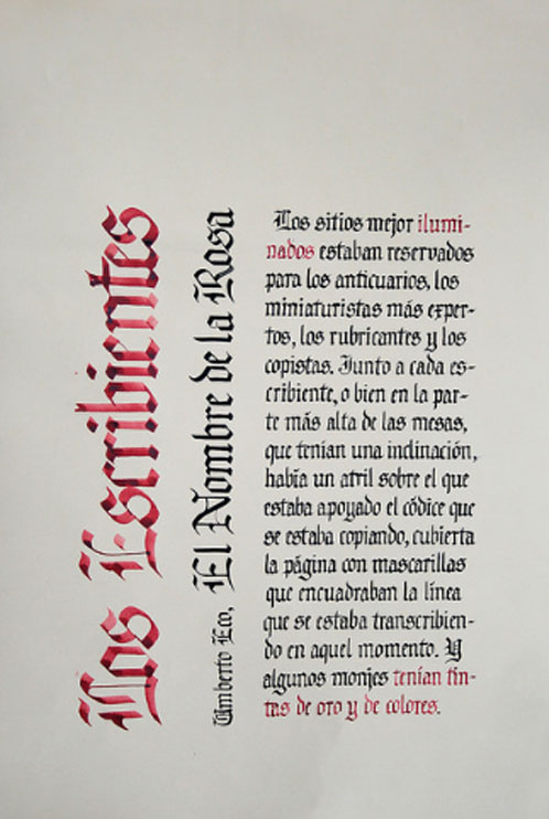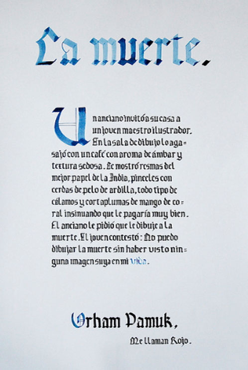 El ejercicio propicia la apropiación del recurso caligráfico al tiempo que indaga algunas de las raíces históricas de la escritura. Los tex- tos en tres tamaños y la relación con el soporte permiten al alumno experimentar sobre puesta en página, jerarquías y orden de lectura.
