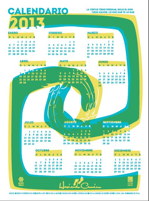 Los alumnos de la Cátedra Zachin de la Fadu (UBA), produjeron más de 40 calendarios para Haciendo Camino. Los diseños del calendario 2013 son mérito de Rodrigo Altamirano Almada y Belén Barbatto; se hicieron en el marco de un trabajo práctico cuya consigna significaba hacer un diseño original de un afiche/calendario para imprimir mediante el método serigrafía.Los objetivos pedagógicos del trabajo práctico se basaron en situar al requerimiento de un diseño, como disparador del proceso tecnológico. El proceso se comenzó a hacer en los talleres de la UBA, en Ciudad Universitaria y se finalizó en la Imprenta Chimango de Santiago Pozzi.La serigrafía permite imprimir sobre cualquier tipo de soporte y es práctico industrialmente.