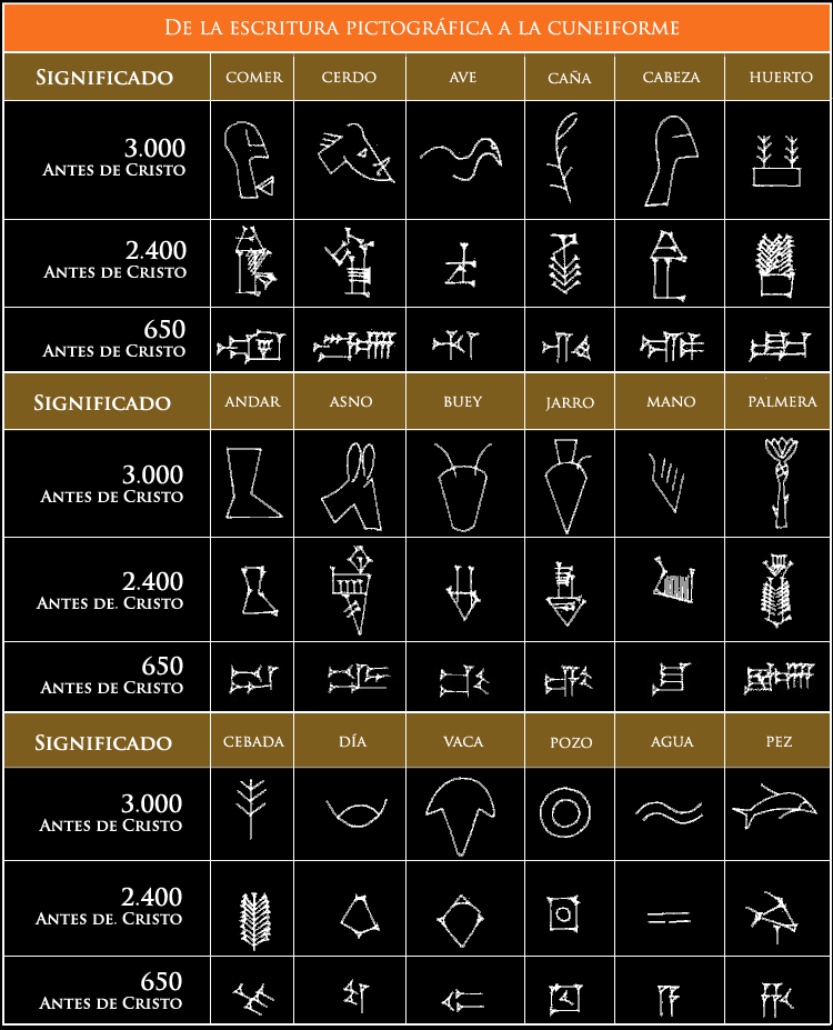 El desarrollo de la escritura pictográfica hacia la cuneiforme, pasó por diferentes etapas.En la ilustración que se muestra a la derecha, se puede ver como las imágenes del 3.000 antes de Cristo, son claramente formas pictográficas que aparecen en el sistema proto-sumerio.Los de las segundas filas ya son una representación cuneiforme de hacia el 2400 a. C., obsérvese que todavía hay un acercamiento al dibujo original, pero ya se tiende a representar las ideas por signos abstractos. Finalmente, los signos de las terceras filas, del 650 a. C., son definitivamente silábicos, y allí puede verse su equivalencia fonética sumeria y su significado.