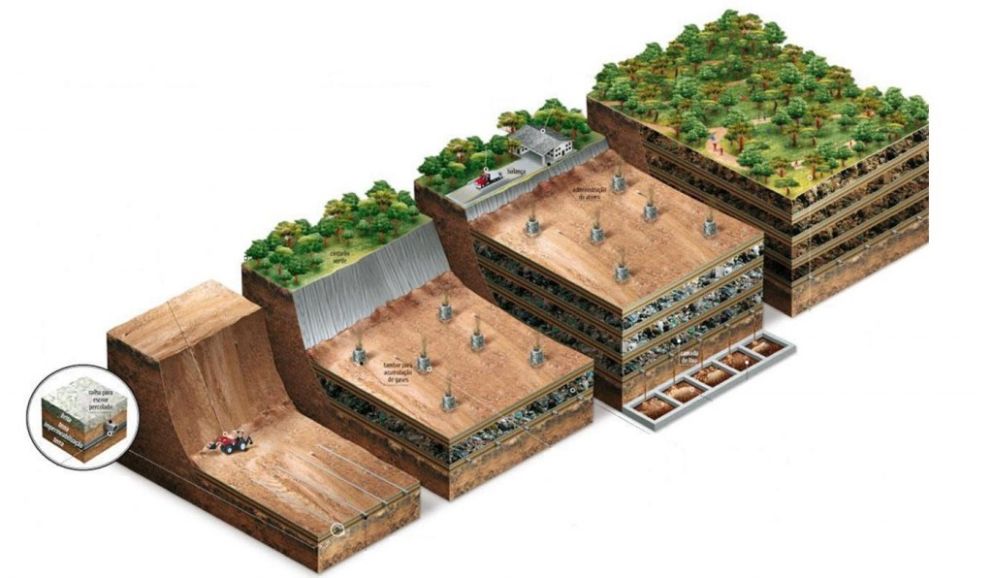 Un relleno sanitario está compuesto básicamente por una depresión en el terreno, cubierta por una membrana inferior, un sistema de recolección de líquidos lixiviados, un sistema de recolección de gases, y ocasionalmente, una cobertura. No necesariamente todos estos elementos están presentes en todos los rellenos sanitarios.
