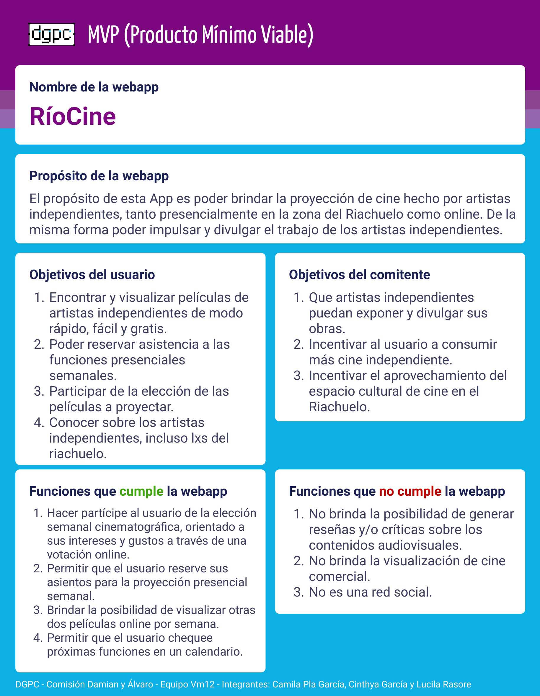 El propósito de nuestra Webapp es poder brindar la proyección de cine hecho por artistas independientes, tanto presencialmente en la zona del Riachuelo como online. De la misma forma poder impulsar y divulgar el trabajo de los artistas independientes.