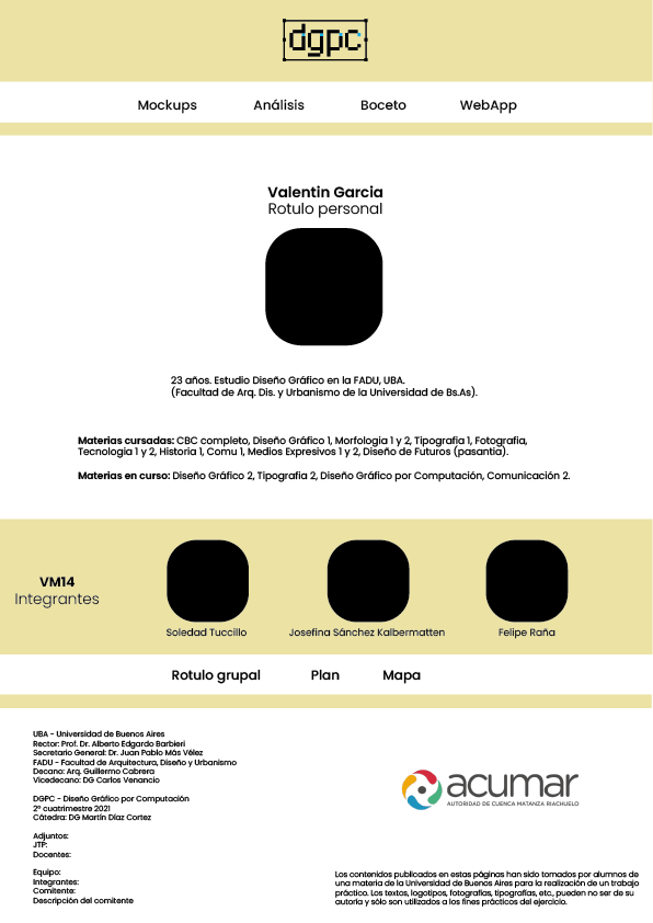 Materias cursadas: CBC completo, Diseño Gráfico 1, Morfologia 1 y 2, Tipografia 1, Fotografia, Tecnologia 1 y 2, Historia 1, Comunicación 1, Medios Expresivos 1 y 2, Diseño de Futuros