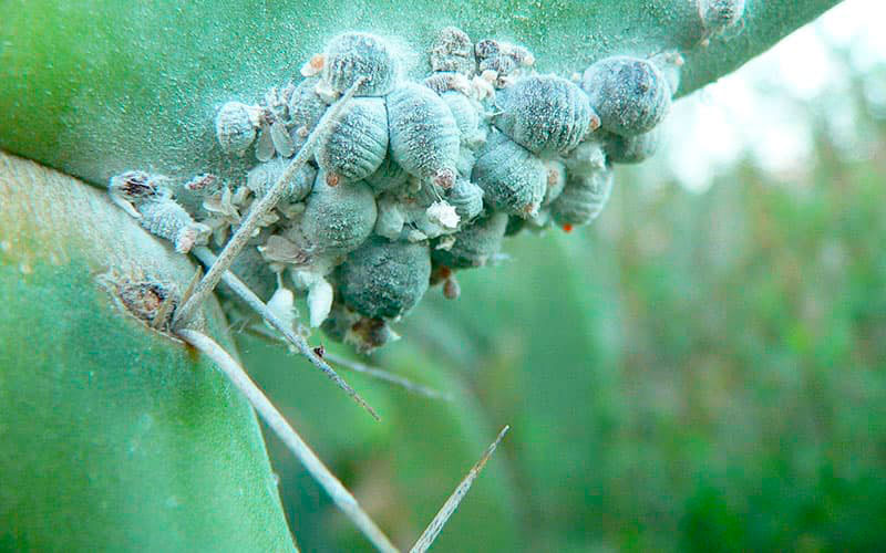 La cochinilla es una chinche de color blanco, y muchas veces con aspecto algodonoso. Parecen como pelusas enganchadas al tallo y a las hojas. Otras veces tienen aspecto duro, como los cascos, pero en miniatura. Todas y cada una de ella dejan un tinte rojo cuando se chafan.