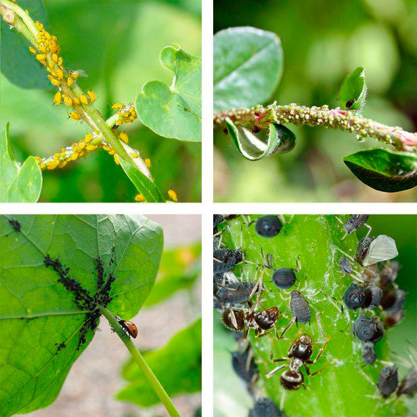 Los pulgones se alimentan de la savia de la planta, y al hacerlo producen el enrollamiento de las hojas, la deformación de los brotes jóvenes y puntitos amarillos allí donde han pegado bocado.