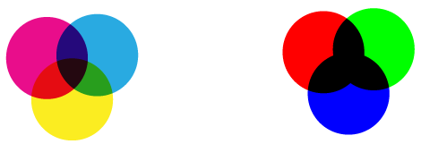 El proceso de reproducción aditivautiliza luz roja, verde y azul para producir el resto de colores. Combinando uno de estos colores primarios con otro en proporciones iguales produce los colores aditivos secundarios: cian, magenta y amarillo. Combinando los tres colores primarios de luz con las mismas intensidades, se produce el blanco. Variando la intensidad de cada luz de color finalmente deja ver el espectro completo de estas tres luces.
