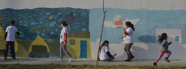 Integrantes de la Coordinación de Cultura, Patrimonio y Educación Socioambiental de ACUMAR participaron en la pintada de un mural en el exterior de la escuela N°77 “Provincia de Santa Cruz” de Lanús.