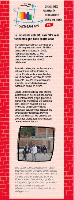 Mostrar la realidad social de la Villa 31 y la impronta cultural que deja la misma. Mostrar desde las últimas noticias de la actualidad hasta historias de sus habitantes, que reflejen la situación de la villa.
