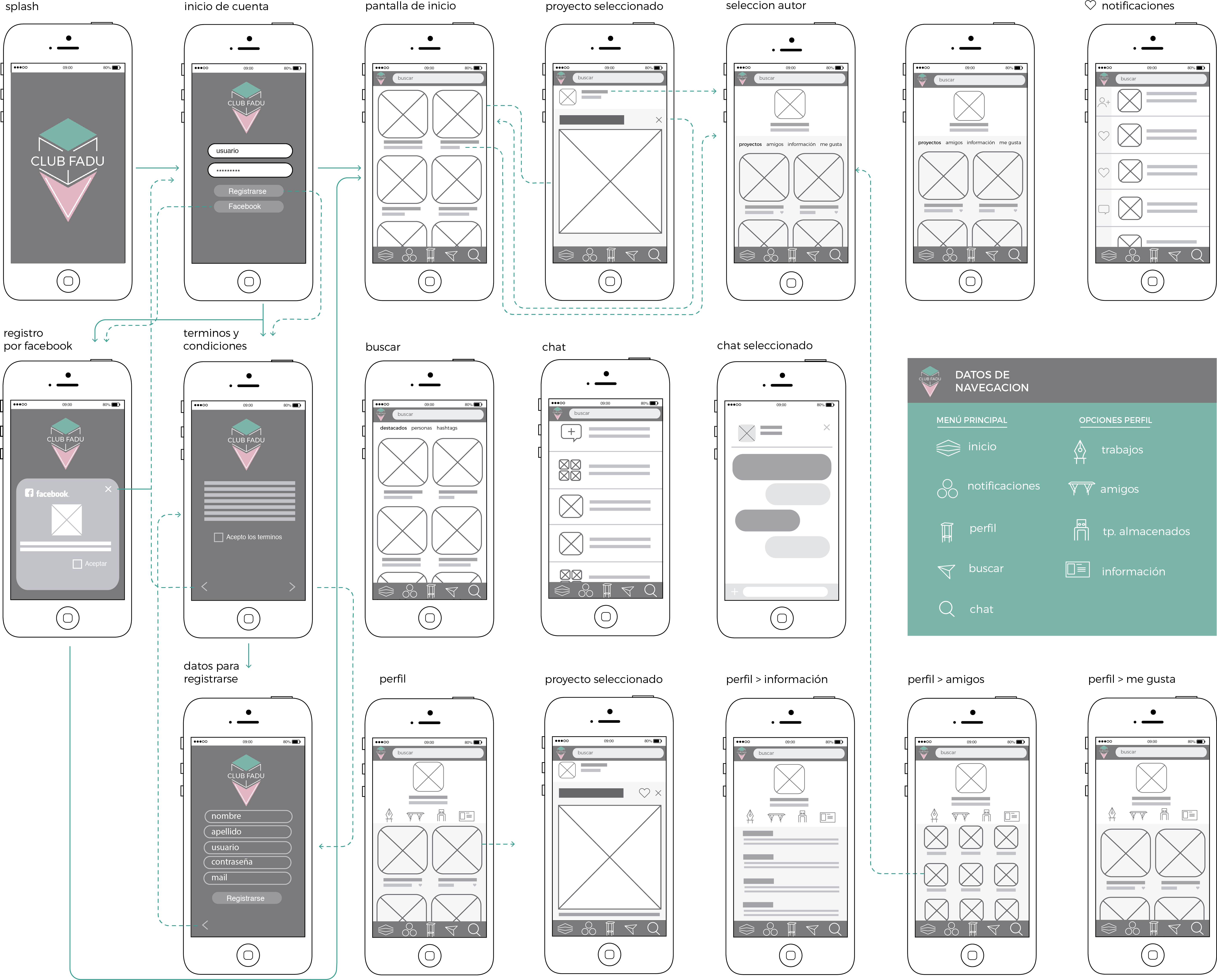 En primera instancia, se inicia un splash con el logo de la app seguido de la opción de registrarse para iniciar una cuenta personal (desarrollando los términos y condiciones) o simplemente tomar los datos de facebook y ahorrarse pasos.