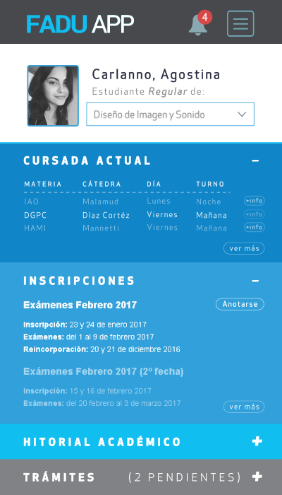 En la pantalla de inicio personal, hay un selector de la carrera sobre la cual quiere cargar sus datos, por defecto aparece la última que seleccionó, en caso de cambiar, los contenidos cambian. Si tiene una sola carrera, no aparece el ComboBox sino un text simple.