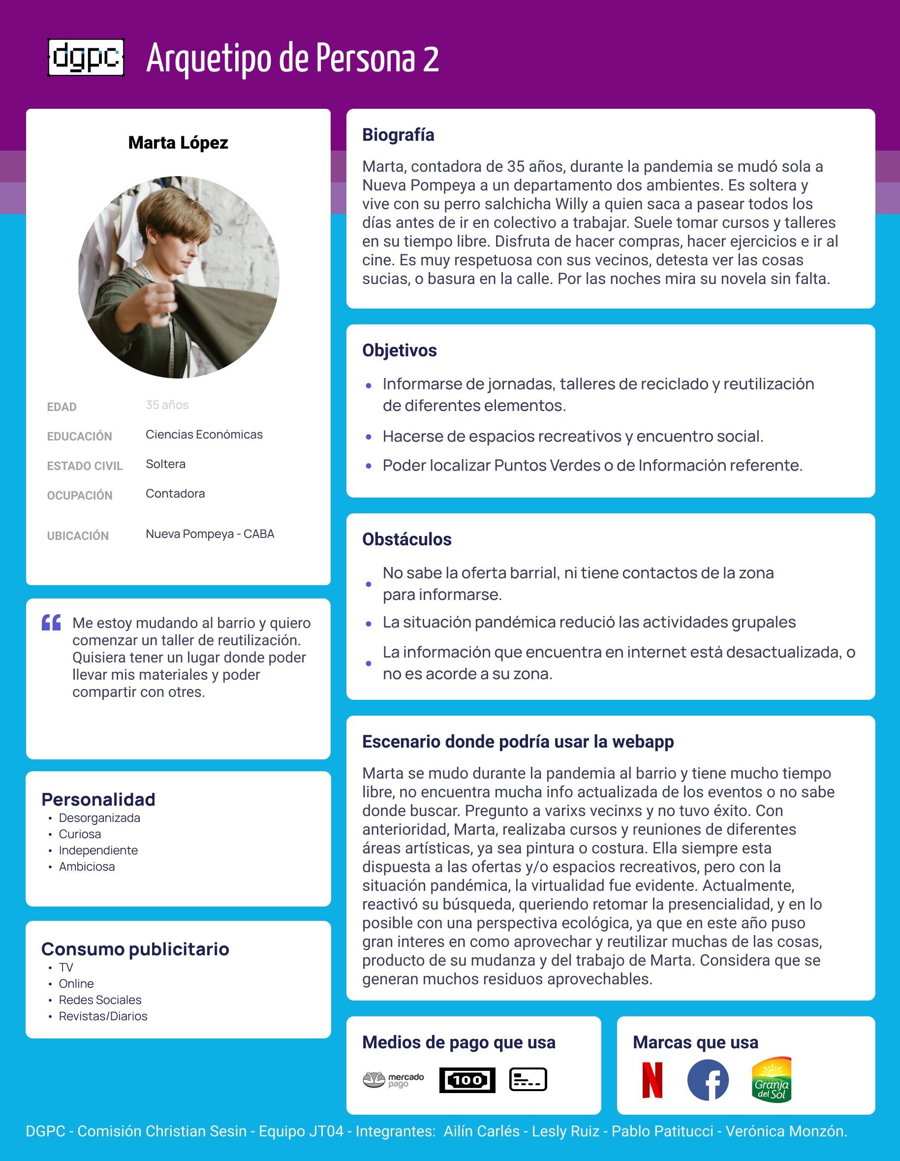 Marta, contadora de 35 años, hace poco se mudó sola a Nueva Pompeya a un departamento dos ambientes. Es soltera y vive con su perro salchicha Willy a quien saca a pasear todos los días antes de ir en colectivo a trabajar