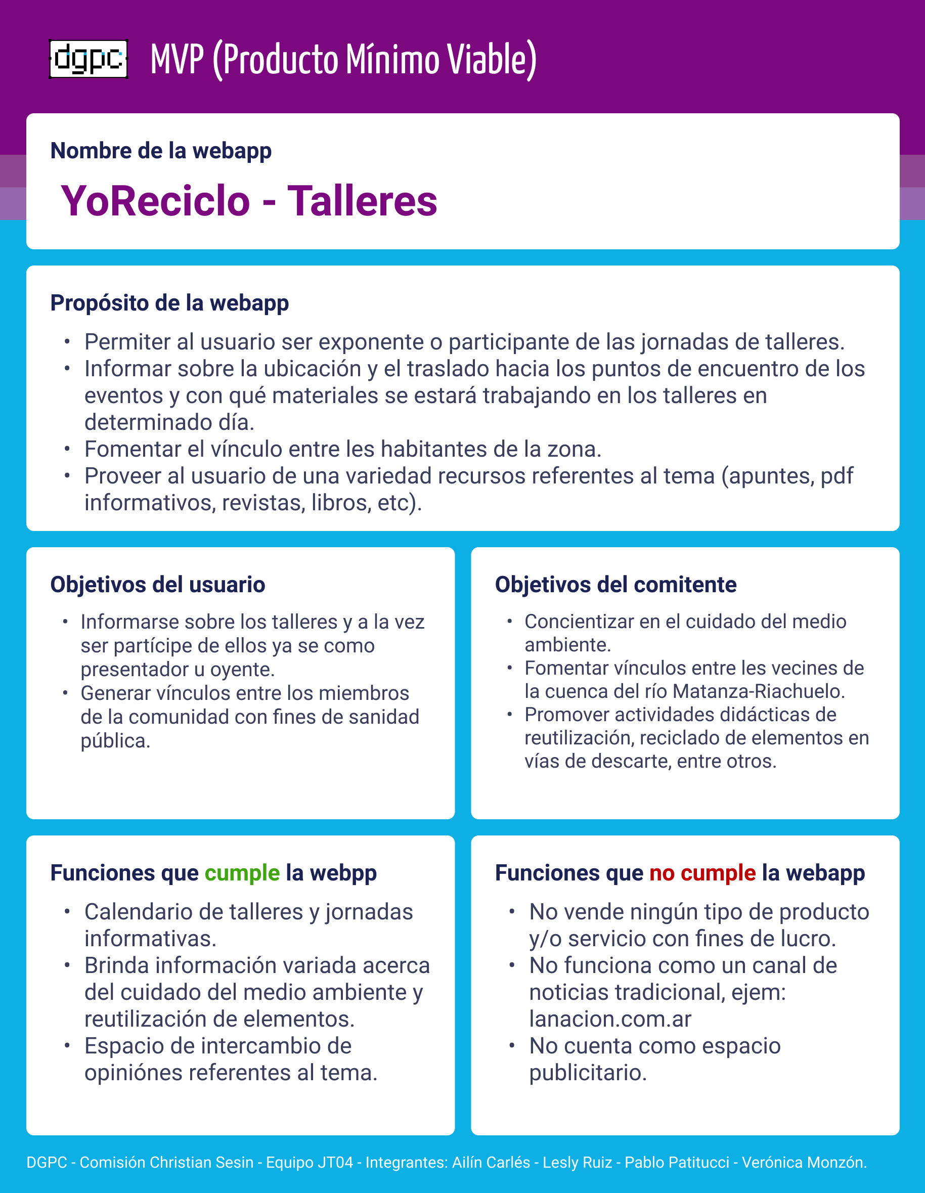 Permiter al usuario ser exponente o participante de las jornadas de talleres. Informar sobre la ubicación y el traslado hacia los puntos de encuentro de los eventos y con qué materiales se estará trabajando en los talleres en determinado día. Fomentar el vínculo entre les habitantes de la zona. Proveer al usuario de una variedad recursos referentes al tema (apuntes, pdf informativos, revistas, libros, etc).