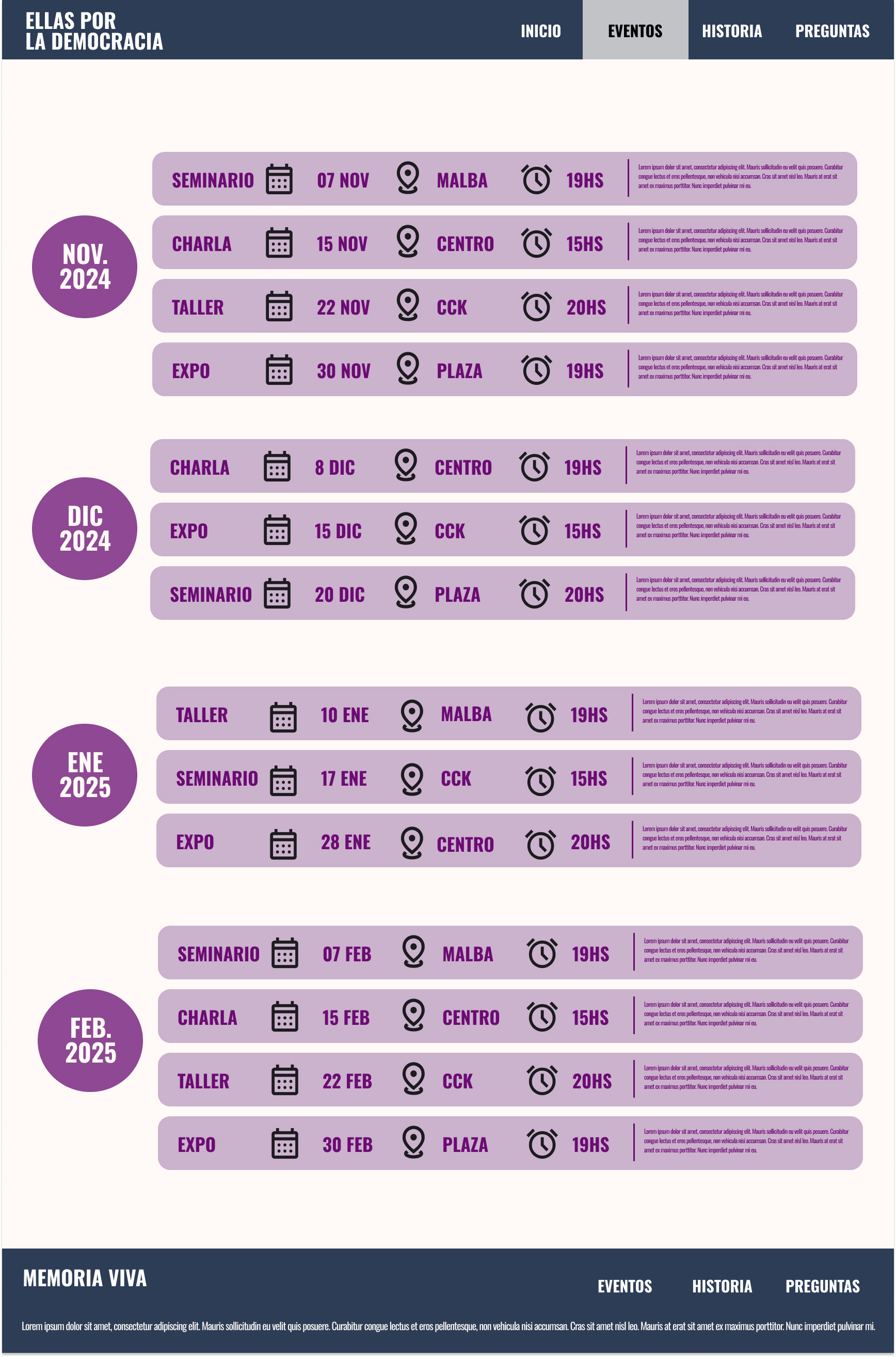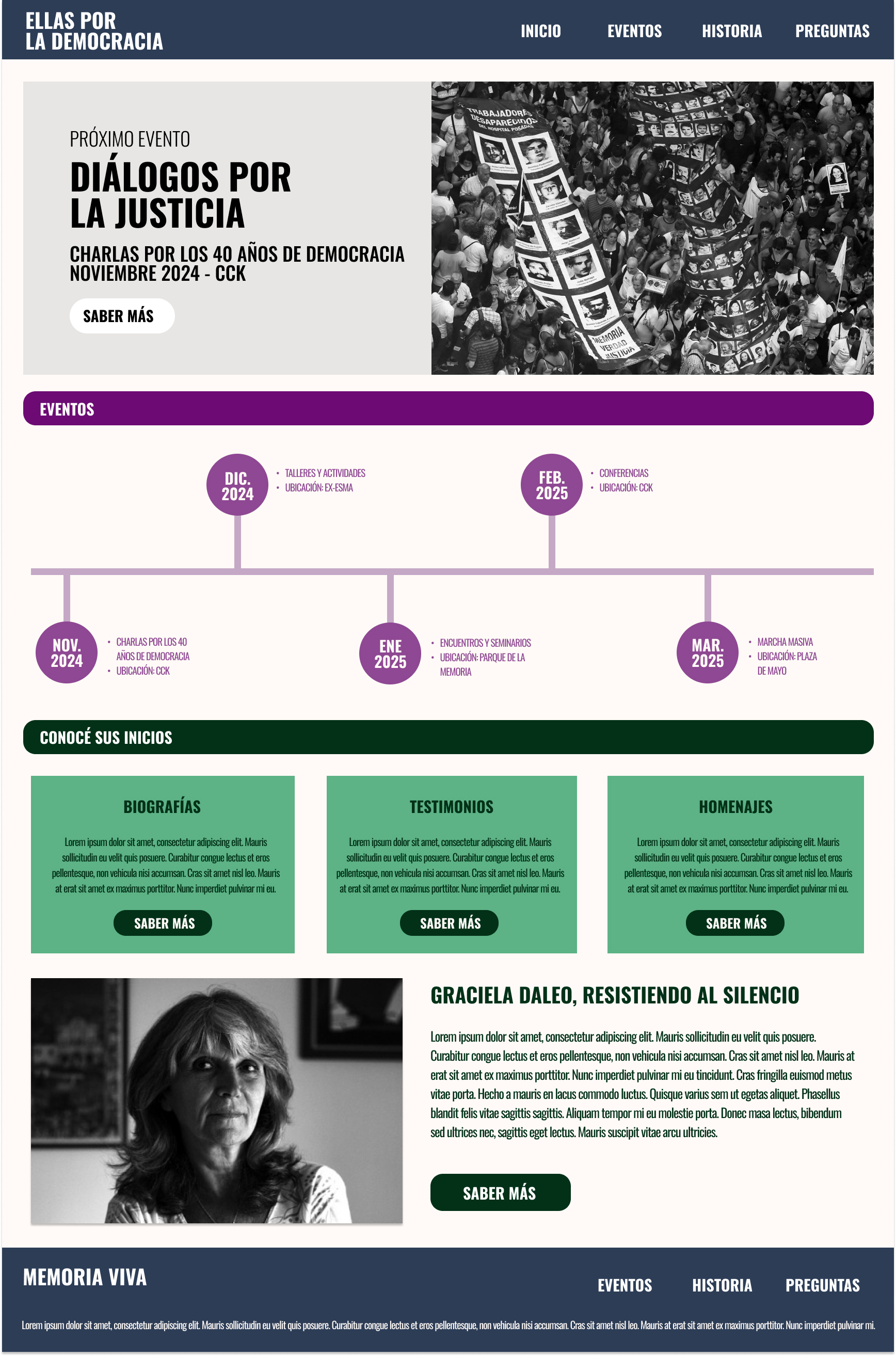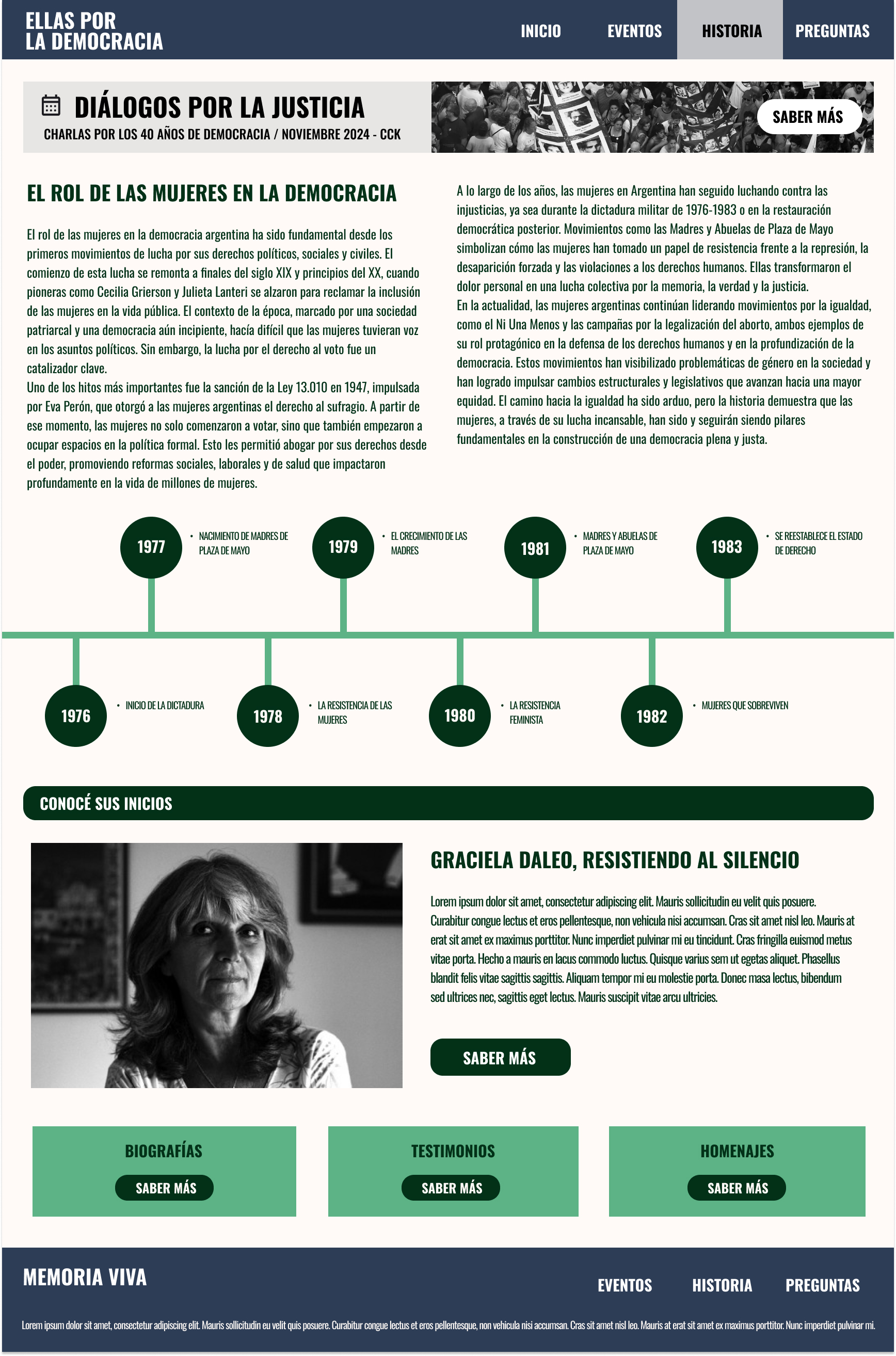Memoria Viva será una webapp interactiva y fácil de navegar, diseñada para brindar una experiencia fluida y accesible. Al ingresar, los usuarios encontrarán un menú que los guiará a las diferentes secciones: Historia, ¿Quiénes somos?, Recursos Educativos y Preguntas Frecuentes.